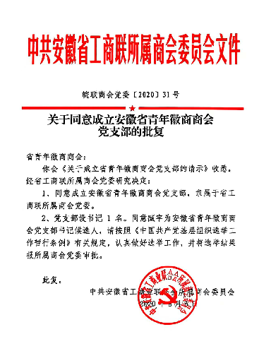在安徽省委统战部、省工商联的指导下,2020年5月商会第二次会员大会胜利召开。省委统战部、省工商联、商会新一届领导班子高度重视青年徽商商会会员的思想理论建设和商会党建工作,提出要尽快成立商会党组织,加强会员理论学习,积极开展党建活动,商会积极筹备成立党支部。2020年8月5日,安徽省工商联所属商会党委正式批复同意成立安徽省青年徽商商会党支部。